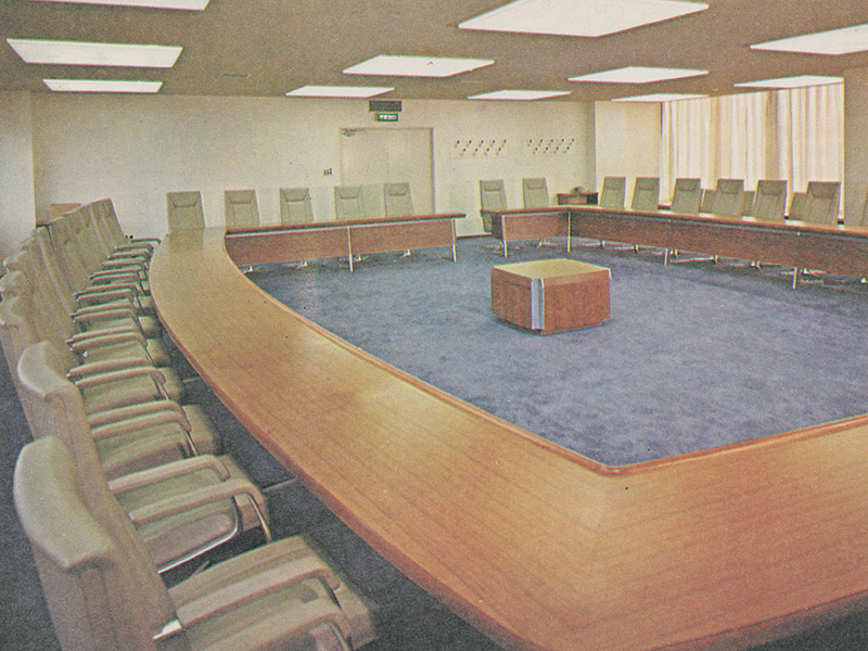 写真からも伺えるように、昭和45年当時の旧会館は、周辺の街並みの中でもひときわ目を引く近代的な建物でした。当時の会員数は約800事業所。現在の約5分の1の規模でしたが、旧会館建設趣意書には「予想外に当地域の発展が目ざましく、急速度な進展を見た今日、会館の利用も加速的に増加し、会館増築後まだ日を浅くして既に狭隘を感じる現況に至った」と記されています。地域経済の成長とともに、商工会議所への期待がいかに大きかったかが伝わってきます。