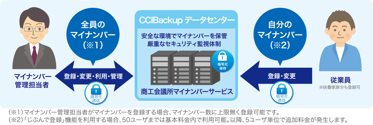 商工会議所マインナンバーサービスは、マイナンバーの収集、保管、利用、削除を安心・安全に行うためのクラウドサービスです。