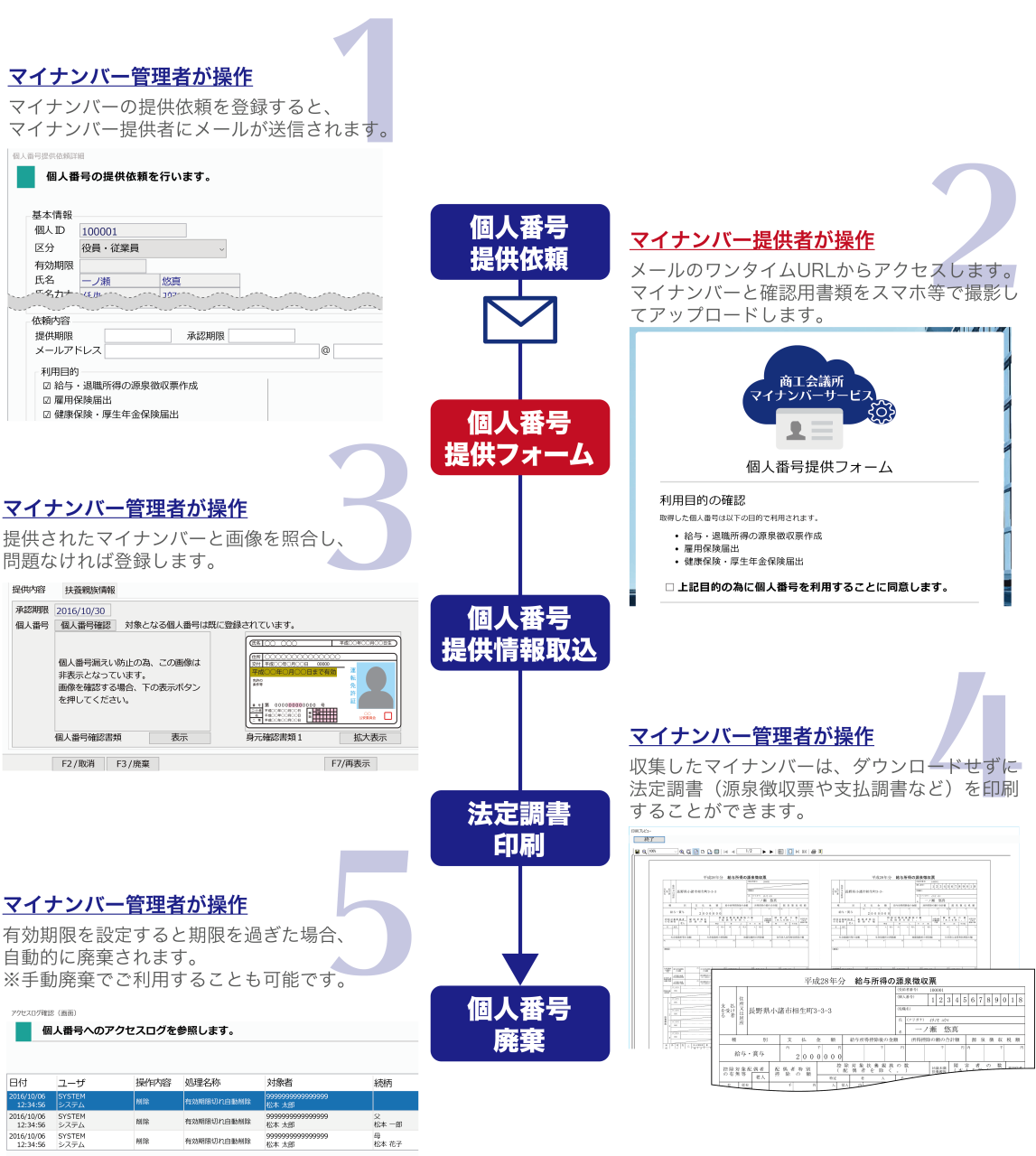 商工会議所が運営する「商工会議所マイナンバーサービス」は、これらの問題を解決するためのクラウドサービスです。マイナンバーの収集、保管、利用、削除を効率的に行え、安心・安全なマイナンバー管理を実現できます。